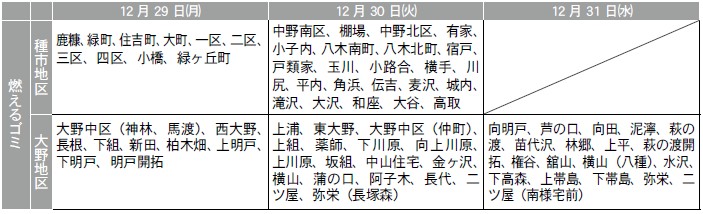 年末年始は、家庭ゴミが多く発生することから、「燃えるゴミ」の特別収集を実施します。収集日は下表のとおりですので、当日の朝8時までに地区内の決められた集積所に出してください。12月30日(火)から令和8年1月4日(日)までは、処理場への直接搬入はできません。また、「燃えないゴミ」、「資源物」の特別収集はありません。