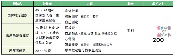 ・国保以外の“被扶養者”は、町の健診会場で受診できる場合がありますのでお問い合わせください。必ず「特定健診受診券」「保険証」を持参してください。内容や料金は保険者ごとに異なります。