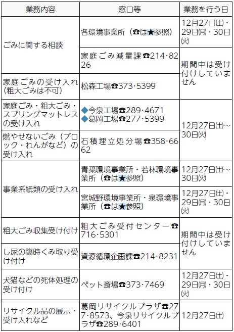 ◆印の工場の窓口は、年末は大変混み合いますので、早い時期の搬入をお願いします。特に葛岡工場は、待ち時間が長くなることが予想されますので、時間に十分余裕を持ってお越しください