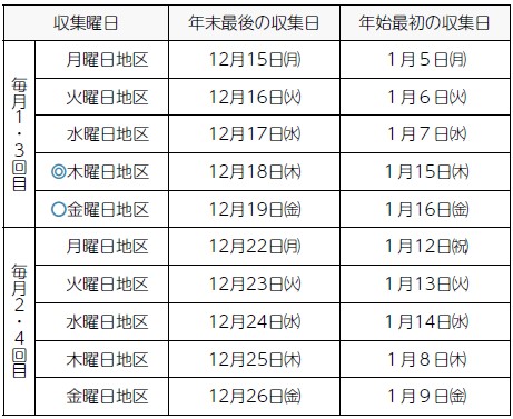収集曜日が毎月1・3回目の木曜日の地区(◎)は、1月1日(祝)の代わりに1月29日(木)に、金曜日の地区(〇)は、1月2日(金)の代わりに1月30日(金)に収集します。