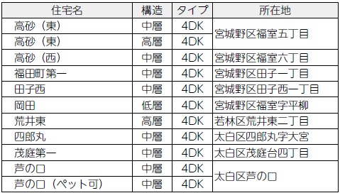 「入居募集のごあんない」:12月5日(金)から市役所国分町分庁舎2階仙台市建設公社募集課、市役所本庁舎2階市政情報センター、区役所総合案内、総合支所、青葉区役所戸籍住民課仙台駅前サービスセンター(アエル5階)などで配布