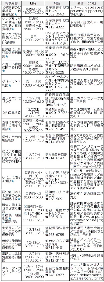 くらし 相談窓口 26/50 前の記事 次の記事 発行日 : 2025年12月01日 自治体名 : 宮城県仙台市 広報紙名 : 仙台市政だより 2025年12月号 秘密厳守 ★は祝休日、12/29(月)~1/3(土)を除く Tweet シェアする のびすくの催し 12月のお知らせ 講座・催し(3)