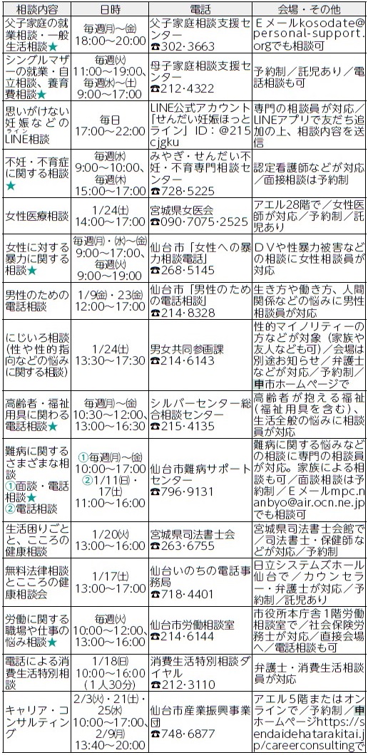 くらし 相談窓口 27/52 前の記事 次の記事 発行日 : 2026年01月01日 自治体名 : 宮城県仙台市 広報紙名 : 仙台市政だより 2026年1月号 秘密厳守 ★は祝休日、12/29(月)~1/3(土)を除く Tweet シェアする 1月のお知らせ 講座・催し(4) 1月のお知らせ 講座・催し(5)