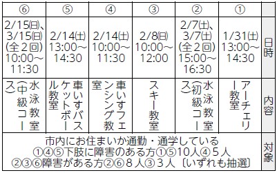 申込み:電話またはファクス、Eメール(申込時の必要事項と年齢、障害の内容、参加希望内容を記入)で(1)~(3)1月24日(4)~(6)2月5日までに。仙台市障害者スポーツ協会ホームページからも申し込めます