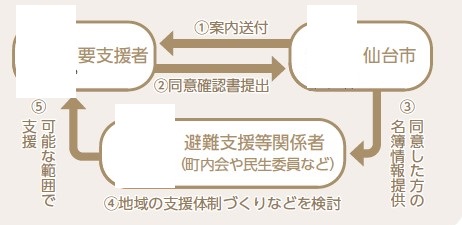 災害時、高齢者や障害者など支援を要する方々が円滑に避難するためには、日頃から避難方法を決めておくとともに、地域での支援体制づくりを進めておくことも大切です。市ではこれまで「災害時要援護者情報登録制度」を通じ、避難支援が必要な方の情報を町内会などへ提供してきましたが、登録は本人などの申請に基づくことから、真に支援が必要な方を把握できないという課題がありました。