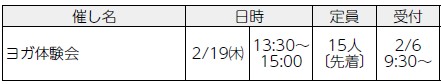 持ち物:ヨガマットまたはバスタオル・上履き・飲み物・タオル