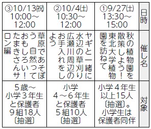 申込み:はがき、ファクスまたはEメールに申込時の必要事項と年齢、参加希望日を記入して(1)9月17日(2)9月24日(3)10月3日(いずれも必着)までに。せんだい環境Web(ウェブ)サイトたまきさん(【URL】https://www.tamaki3.jp/)からも申し込めます