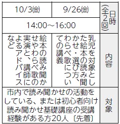対象:市内の小学校や児童館などでこどもに向けた読み聞かせの活動をしている方30人〔抽選〕