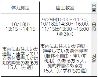 申込み:電話またはファクス、Eメール(申込時の必要事項と年齢、参加希望内容、障害の内容を記入)で9月12日までに。仙台市障害者スポーツ協会ホームページからも申し込めます