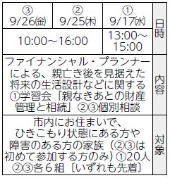 申込み:9月8日午前10時から電話でNPO法人障がい者の暮らしとお金の相談室