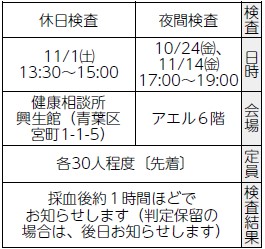 申込み:検査日の2週間前~前日までの平日午後1時~4時に予約専用電話【電話】090・4478・4641で。市ホームページからも申し込めます