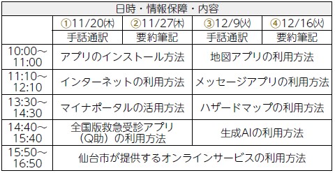 申込み:往復はがきまたはファクスに申込時の必要事項と参加希望日時、内容、年齢、Eメールアドレス(お持ちの方)、スマートフォン所有の有無、付き添いの有無、手話通訳・要約筆記が必要な場合はその旨も記入して(1)10月30日(2)11月6日(3)11月18日(4)11月25日(いずれも必着)までに(株)ジェイコム埼玉・東日本 仙台局(〒981-3135泉区八乙女中央2-3-20)
