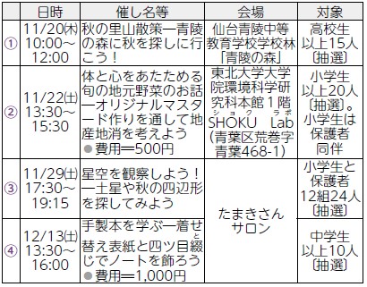 申込み:はがき、ファクスまたはEメールに申込時の必要事項と年齢、参加希望日を記入して(1)(2)11月13日(3)11月19日(4)12月4日(いずれも必着)までに。せんだい環境Web(ウェブ)サイトたまきさん【URL】https://www.tamaki3.jp/からも申し込めます