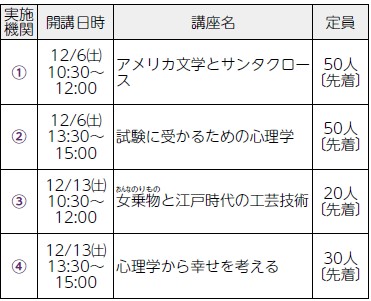 申込み:11月6日9:00からファクスまたはEメール(件名に「公開講座申し込み」と記入)に申込時の必要事項を記入して各実施機関へ