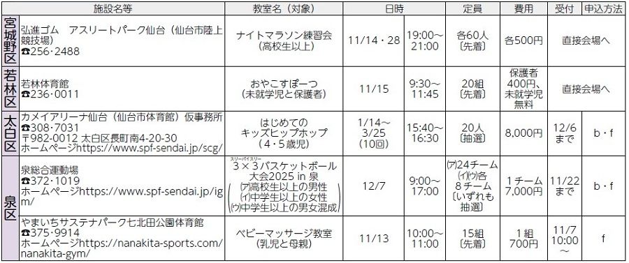 各施設の催しについては仙台スポーツ情報ナビ【URL】https://www.spf-sendai.jp/をご覧ください