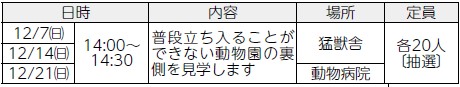 日時:12月6日(土)・7日(日)10:00~11:00、11:00~12:00、13:00~14:00、14:00~15:00(荒天時中止)