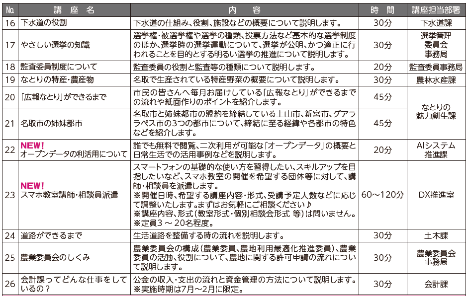 講座 市マナビィ講師派遣事業 出前講座(2) 14/66 前の記事 次の記事 発行日 : 2025年04月01日 自治体名 : 宮城県名取市 広報紙名 : 広報なとり 令和7年4月1日号 ★は、直接、保健センター(【電話】382-2456)へ申し込み。 Tweet シェアする 市マナビィ講師派遣事業 出前講座(1) 市マナビィ講師派遣事業 出前講座(3)
