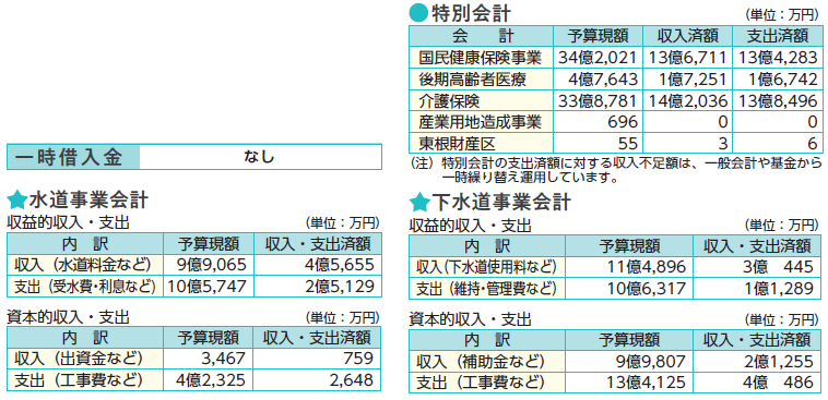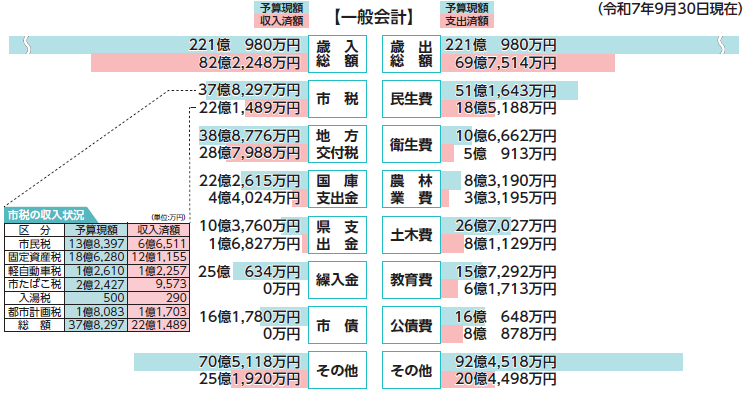 一般会計は、当初予算が167億8800万円でしたが、必要な補正や令和6年度からの繰越事業を含めた結果、現在の予算は221億980万円となりました。この予算現額に対し、収入済額は82億2248万円で収入率は37・2%、支出済額は69億7514万円で執行率は31・5%です。一般会計と特別会計、水道事業会計、下水道事業会計を合わせた予算総額は、333億7269万円となっています。