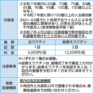 今年度の対象者は、今年度中に限り定期接種として接種可能です。接種を希望する人は、早めの接種をお願いします。令和8年4月1日以降は任意接種となり、全額自己負担となりますのでご注意ください。