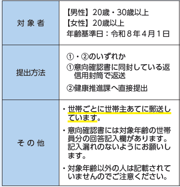 また、健診を受けない人も「受けない」に〇をつけて必ずご提出ください。詳細は、2月下旬に送付した意向確認書および同封のチラシをご覧ください。