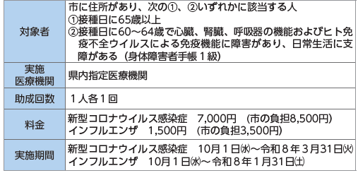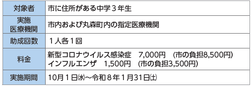 市では中学3年生と高齢者を対象に、新型コロナウイルス感染症予防接種およびインフルエンザ予防接種の料金の一部を次のとおり公費負担します。