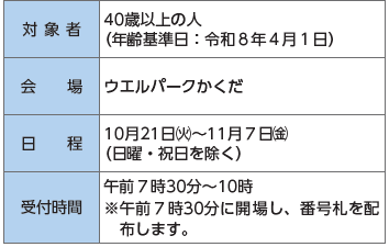 次の日程で検診を実施します。申し込んだ人は、忘れずに受診してください。