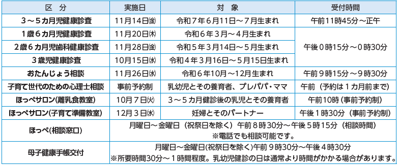 ・乳幼児健診などの年間予定は、市ホームページまたは子育て支援アプリ「ほっぺなび」に掲載しています。