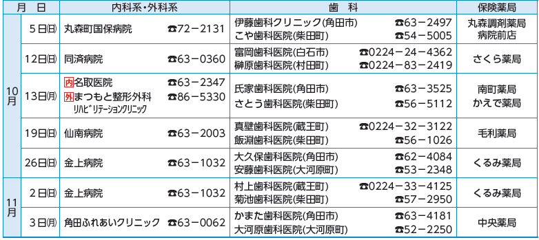 ・毎夜間(午後5時30分~翌午前7時30分)市内の病院を中心に急患診療を行っています。診療科目などの問い合わせは角田消防署(【電話】63-1011)へ。