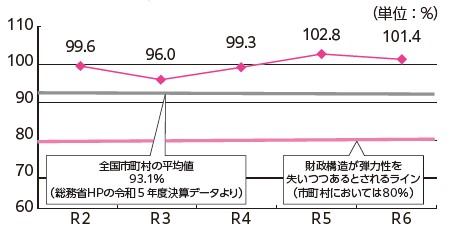 令和6年度決算における本市の比率は、昨年度より1.4%改善し、101.4%となりました。全国市町村の平均値(93.1%)を超える状況が続いていますが、都市計画税などの、比率の算定に含まれない一部財源を踏まえると、臨時的な事業にも対応できており、財政運営上の問題は生じていません。