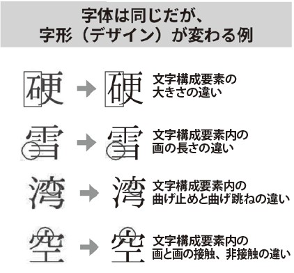 この標準文字の導入により、住民票の写しや各種証明書、郵送物の宛名などに使用する文字の形が右図のように変化する場合があります。なお、部首の大きさや「止め」「跳ね」の違いなど、字形(デザイン)の範囲内で変化することがありますが、字体(漢字の骨組み)に変化はありません。