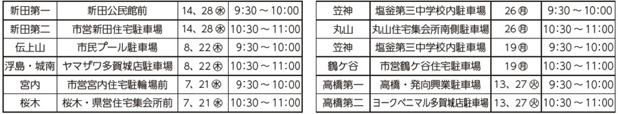 くらし 移動図書館 さざんか号 1月の運行 26/36 前の記事 次の記事 発行日 : 2026年01月01日 自治体名 : 宮城県多賀城市 広報紙名 : 広報多賀城 令和8年1月号 *雨(霧雨を含む)、降雪時などは巡回を中止します。中止になった分の振り替え巡回はありません。 問合せ:市立図書館 【電話】368-6226 Tweet シェアする 市立図書館(おはなし会) 交流広場(1)