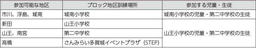 *ブロック地区訓練以外の地区で実施する訓練は、地区ごとに内容が異なりますので、地区の防災担当者、子どもが通学する学校、危機管理課まで問い合わせてください。