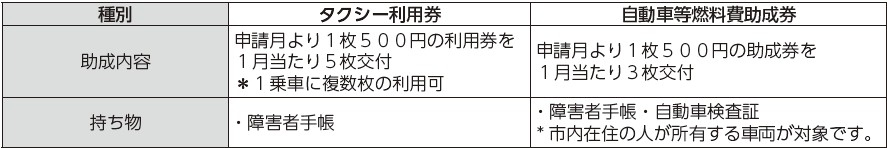 公共交通機関の利用が困難な障害のある人に、日常生活の移動に係る経済的負担の軽減を図るため、自動車等燃料費助成券かタクシー利用券のどちらかを交付します。