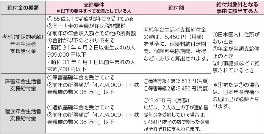 この給付金は、年金受給者の生活支援のため、年金に上乗せして給付されるものです。給付には、前年の年金収入額とその他の所得額の合計が一定基準以下であることなどの要件があります。