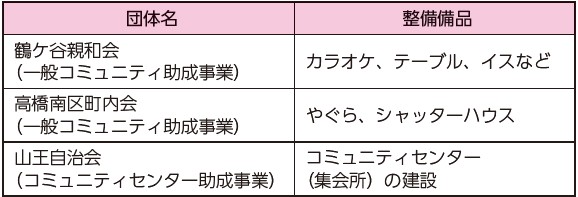 令和7年度は、一般コミュニティ助成事業で2団体採択され、備品を整備しました。