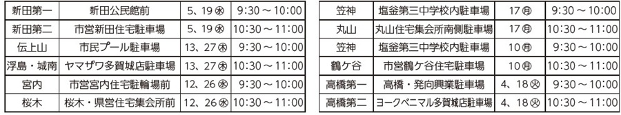 くらし 移動図書館 さざんか号 11月の運行 31/41 前の記事 次の記事 発行日 : 2025年11月01日 自治体名 : 宮城県多賀城市 広報紙名 : 広報多賀城 令和7年11月号 *雨(霧雨を含む)、降雪時などは巡回を中止します。中止になった分の振り替え巡回はありません。 問合せ:市立図書館 【電話】368-6226 Tweet シェアする 市立図書館(おはなし会) 交流広場(1)