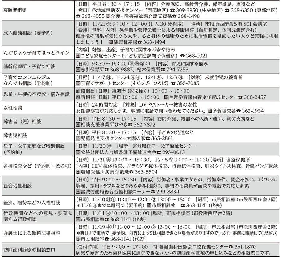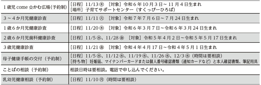 子育て 健康and相談ガイド 38/41 前の記事 次の記事 発行日 : 2025年11月01日 自治体名 : 宮城県多賀城市 広報紙名 : 広報多賀城 令和7年11月号 ■こどもの健康 場所:母子健康センター *健康診査の対象者には個別通知します。人数調整などのため市HP、子育て応援アプリ「たがすく」に載せている対象生年月日と異なることがあります。 問合せ:子ども家庭課親子保健係 【電話】368-1109 ■11月の相談 相談方法など詳しくは、各窓口に問い合わせてください。 Tweet シェアする 休日の診療など フォトトピックス