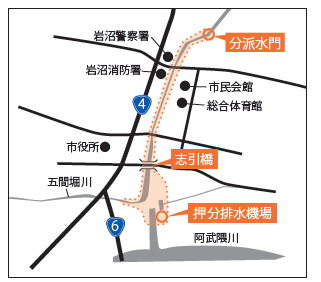 次の期間中、五間堀川の水位(志引橋地点)が最大1メートル程度上昇します。また、五間堀川の水位上昇区間で接続している境堀、丸沼堀、内矢来堀、外矢来堀の水位も併せて上昇します。