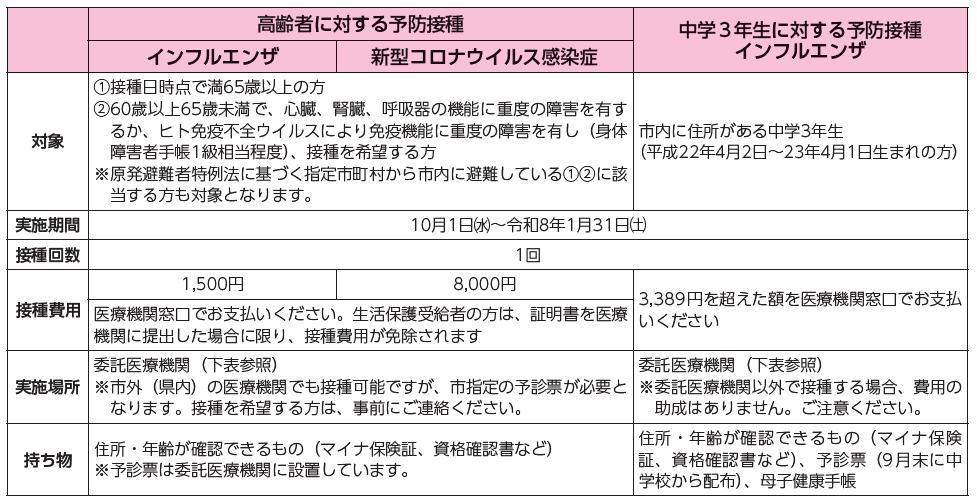 インフルエンザと新型コロナウイルスの感染による発症と重症化予防を目的として、予防接種費用の一部を助成します。