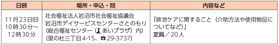 健康 家族介護教室を開催します[無料] 12/31 前の記事 次の記事 発行日 : 2025年11月01日 自治体名 : 宮城県岩沼市 広報紙名 : 広報いわぬま 令和7年11月号 家族の介護をしている方、介護する可能性がある方、介護している方を支援している方、介護保険制度や介護予防、認知症に関心のある方を対象に家族介護教室を開催します。 問合せ:介護福祉課 【電話】24-3016 Tweet シェアする アルコールのことで困っていませんか? 集(あつ)マルシェを開催します[無料]