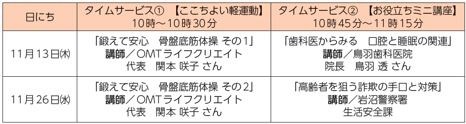 イベント 集(あつ)マルシェを開催します[無料] 13/31 前の記事 次の記事 発行日 : 2025年11月01日 自治体名 : 宮城県岩沼市 広報紙名 : 広報いわぬま 令和7年11月号 時間:10時~11時30分 会場:竹駒神社参集殿 対象:65歳以上の市民 ※タイムサービスは席がなくなり次第、受け付けを終了します。 問合せ:介護福祉課 【電話】24-3016 Tweet シェアする 家族介護教室を開催します[無料] 地域包括支援センターからのお知らせ