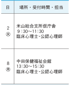 医師・臨床心理士などが相談に応じます。安心してご相談いただくため、完全予約制です。相談日前日(土日、祝日を除く)まで、下記の総合支所まで申し込みください。