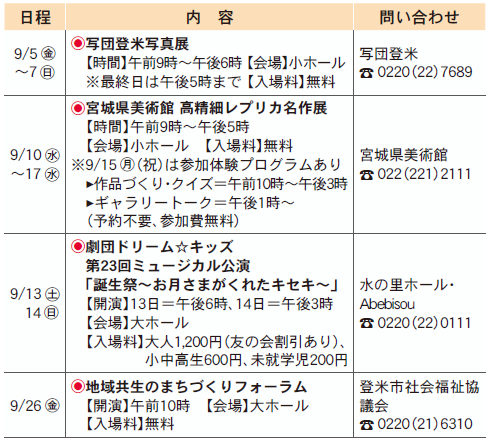 イベント 水の里ホール・Abebisou(登米祝祭劇場)9月のイベント情報 27/36 前の記事 次の記事 発行日 : 2025年08月19日 自治体名 : 宮城県登米市 広報紙名 : 広報とめ 9月号(364号) ※休館日:1日、8日、16日、22日、29日 ※入場料は前売り価格です ※文化・教育関連のイベントを中心に掲載しています Tweet シェアする 【情報広場】お知らせ 【情報広場】相談