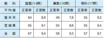 各教科の平均正答率(%)と正答数(問)