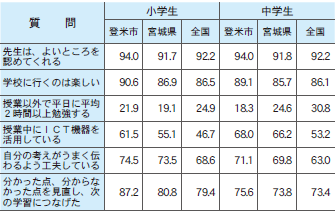 市で策定した授業づくりの指針「登米市学習スタンダード」の活用を全ての学校でさらに進めるとともに、今年度の重点的取組である基礎的な学力の定着と活用する力の伸長を図り、主体的・対話的で深い学びにつながる「より分かる授業づくり」を推進します。また、各学校では、結果の分析と課題を把握し、具体的な指導場面を「授業」「家庭学習」などに設定して指導改善に努めていくことで、学習の定着を図っていきます。今後も、市の全教職員が児童生徒の特性に応じた学びと、共に学ぶ共同的な学びを巧みに融合させ、一体的な充実を図ることで、児童生徒一人一人が基礎的・基本的な知識・技能を習得し、「分かる」「できる」楽しさを実感できるよう学力向上の取組を推進します。さらに、学び直しや家庭学習の充実につながるよう効果的なICTの活用実践も進めます。