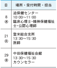 医師・臨床心理士などが相談に応じます。安心してご相談いただくため、完全予約制です。相談日前日(土日、祝日を除く)まで、下記の総合支所まで申し込みください。