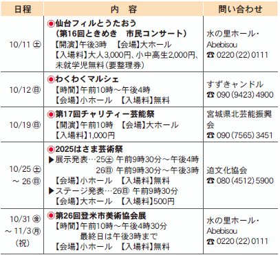 イベント 水の里ホール・Abebisou(登米祝祭劇場) 10月のイベント情報 26/36 前の記事 次の記事 発行日 : 2025年09月17日 自治体名 : 宮城県登米市 広報紙名 : 広報とめ 10月号(365号) ※休館日:6日、14日、20日、27日 Tweet シェアする ねんきんだより 【情報広場】相談(1)