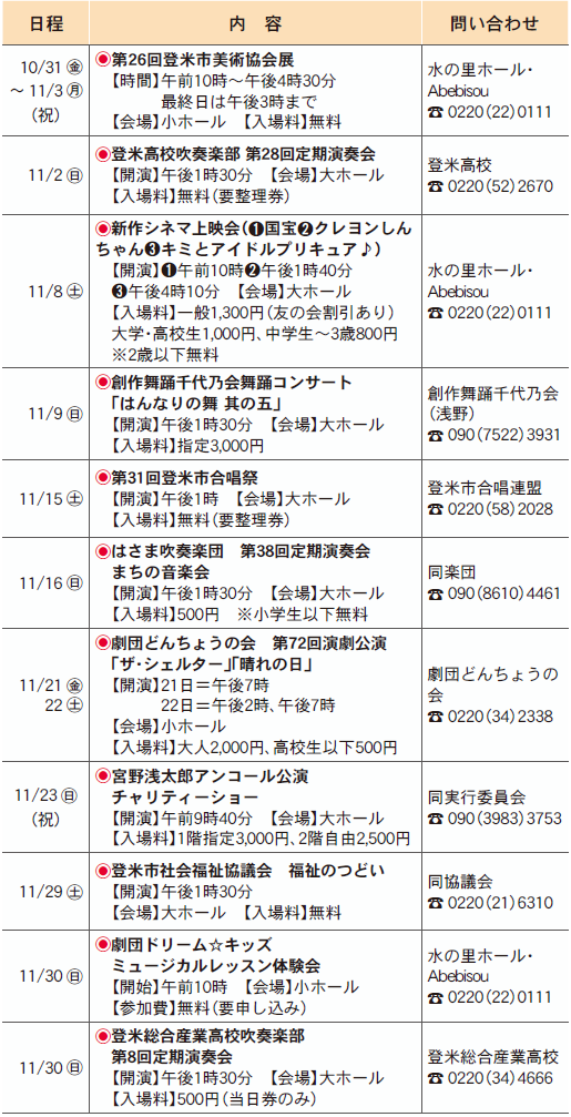 イベント 水の里ホール・Abebisou(登米祝祭劇場)11月のイベント情報 33/44 前の記事 次の記事 発行日 : 2025年10月20日 自治体名 : 宮城県登米市 広報紙名 : 広報とめ 11月号(366号) ※休館日は、4日、10日、17日、24日です ※入場料は前売り価格です ※文化・教育関連のイベントを中心に掲載しています Tweet シェアする 宮城県最低賃金の改正について 令和7年分年末調整等関連サイト