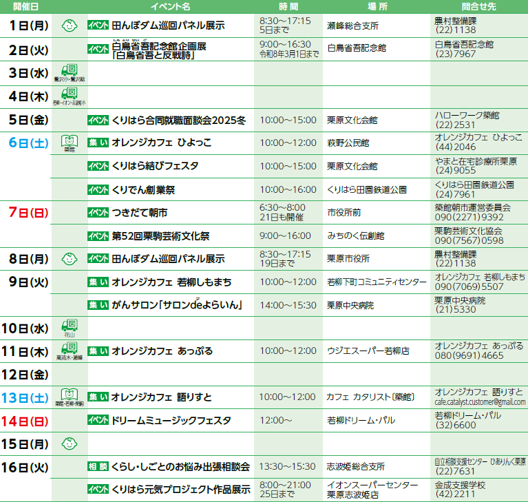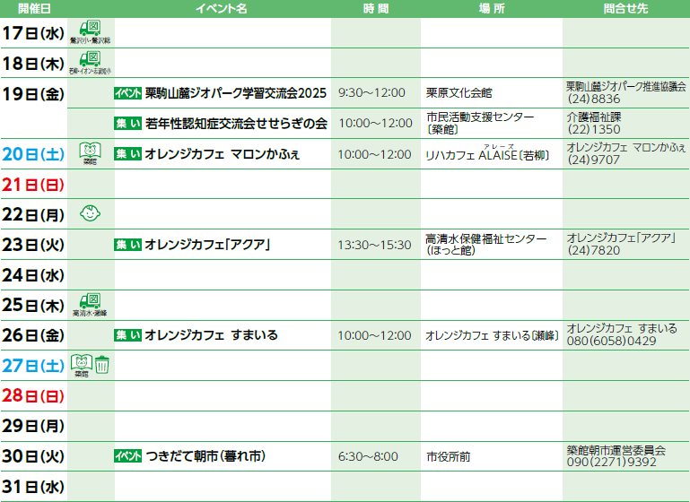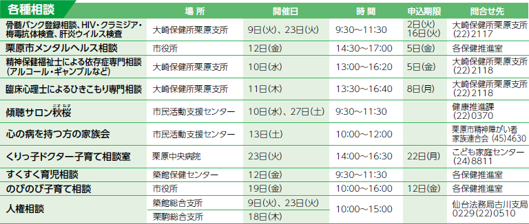 くらし 市内の情報カレンダー 2025年12月 8/26 前の記事 次の記事 記事を読み上げる 発行日 : 2025年12月01日 自治体名 : 宮城県栗原市 広報紙名 : 広報くりはら 令和7年12月号 ※オレンジカフェとは、認知症の人やその家族、地域住民、専門職など、誰でも集える場です。 各保健推進室の問合せ: 市外局番 0228 ・築館・志波姫 【電話】22-1171 ・若柳・金成 【電話】32-2126 ・栗駒・鶯沢 【電話】45-2137 ・高清水・瀬峰 【電話】58-2119 ・一迫・花山 【電話】52-2130 Tweet シェアする 学びのひろば Pick up!