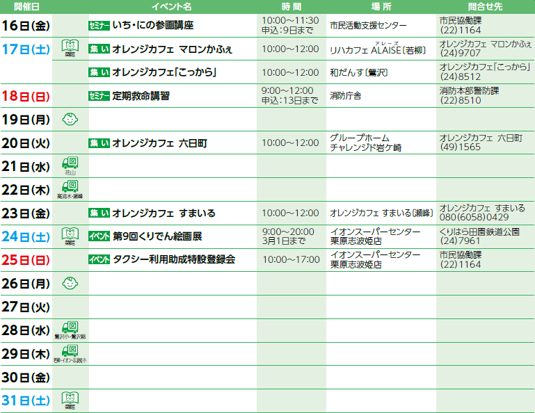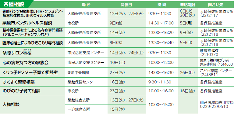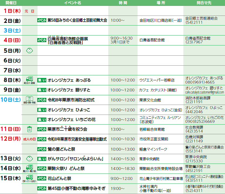 くらし 市内の情報カレンダー 2026年1月 9/28 前の記事 次の記事 記事を読み上げる 発行日 : 2026年01月01日 自治体名 : 宮城県栗原市 広報紙名 : 広報くりはら 令和8年1月号 ※オレンジカフェとは、認知症の人やその家族、地域住民、専門職など、誰でも集える場です。 各保健推進室の問合せ: 市外局番 0228 ・築館・志波姫 【電話】22-1171 ・若柳・金成 【電話】32-2126 ・栗駒・鶯沢 【電話】45-2137 ・高清水・瀬峰 【電話】58-2119 ・一迫・花山 【電話】52-2130 Tweet シェアする 学びのひろば Pick up!